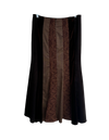 Brown maxi skirt with stripes and different fabric panels on backside.
